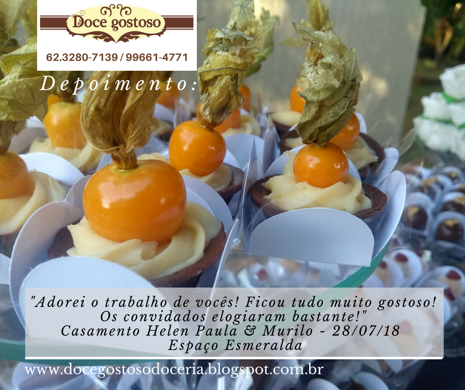 ResponderExcluirA Doce Gostoso já iniciou o diferencial na organização do blog e facebook, morando em outra cidade e o casamento realizado em Goiânia, as fotos e descrições dos doces nos ajudou muito. Quando cheguei na minha festa e olhei minha mesa de bolo e doces fiquei muito feliz e satisfeita, todos os meus convidados elogiaram a beleza e o sabor, só tenho a agradecer a dedicação, pode ter certeza que eu e meu esposo indicamos a Doce Gostoso, obrigada por tudo.